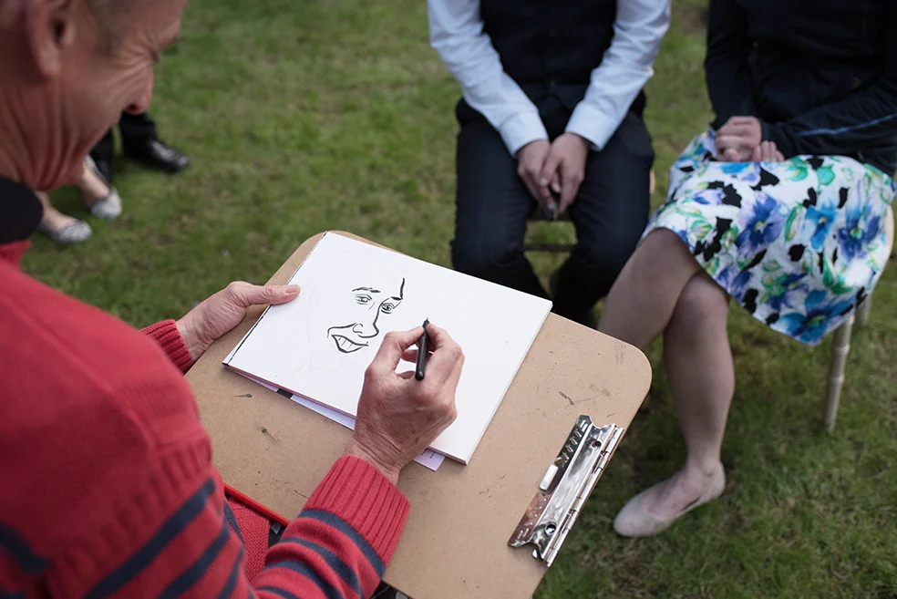 Mark Thatcher can draw up to ten people an hour, on the spot and in black ink on quality paper. Each individual drawing is given to the sitter in a special, clear plastic folder - the perfect momento! You can hire Mark's wedding caricatures for two or three hours, or all day if you wish!